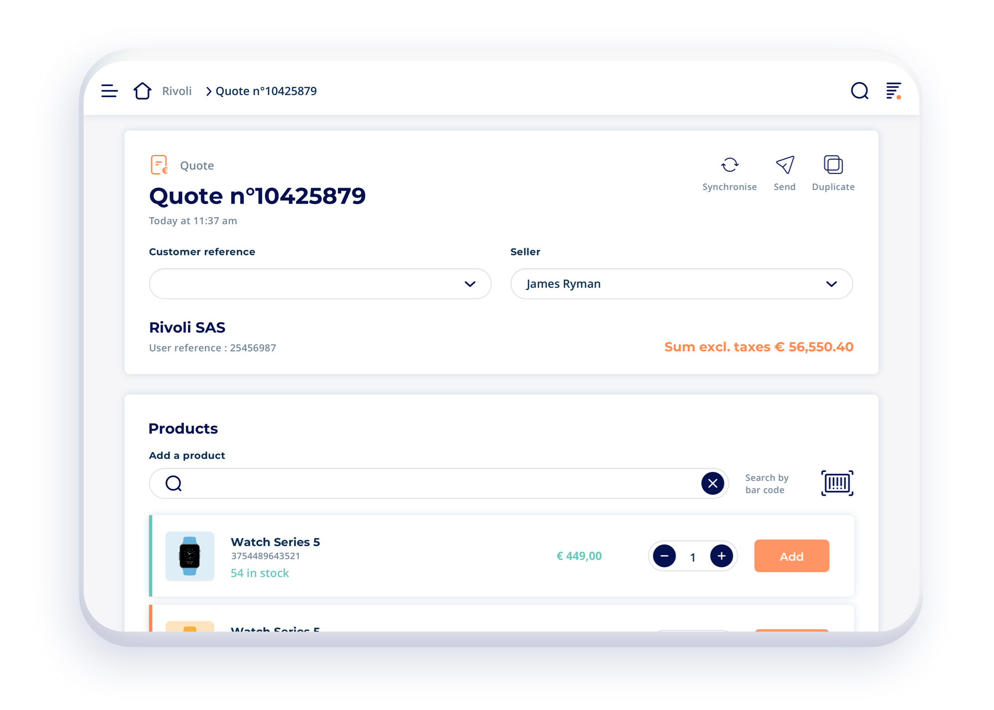 The creation of a quote is simplified and faster than ever before. Make an order in under a minute, even in offline mode. You only have to add a product from the catalogue, add a customer, date, delivery and a means of payment. Press confirm, and that’s it!